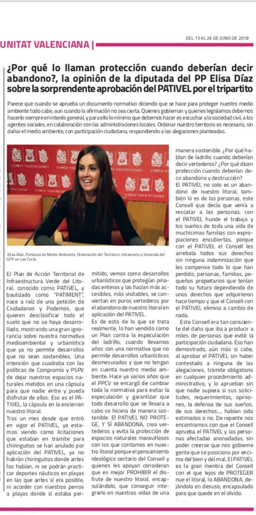 La portavoz de Medio Ambiente de los populares en Les Corts, Elisa Díaz, denunció que la Generalitat «alarga la agonía» del Pativel a pesar de la «cascada de sentencias» en contra. «Ahora, el Consell deja en un limbo sus intentos de expropiación», señaló y añadió que es «sólo el principio del fin del Pativel». La diputada indicó que el PP «quiere saber el coste económico que tendrá para todos los valencianos la insistencia con este plan».