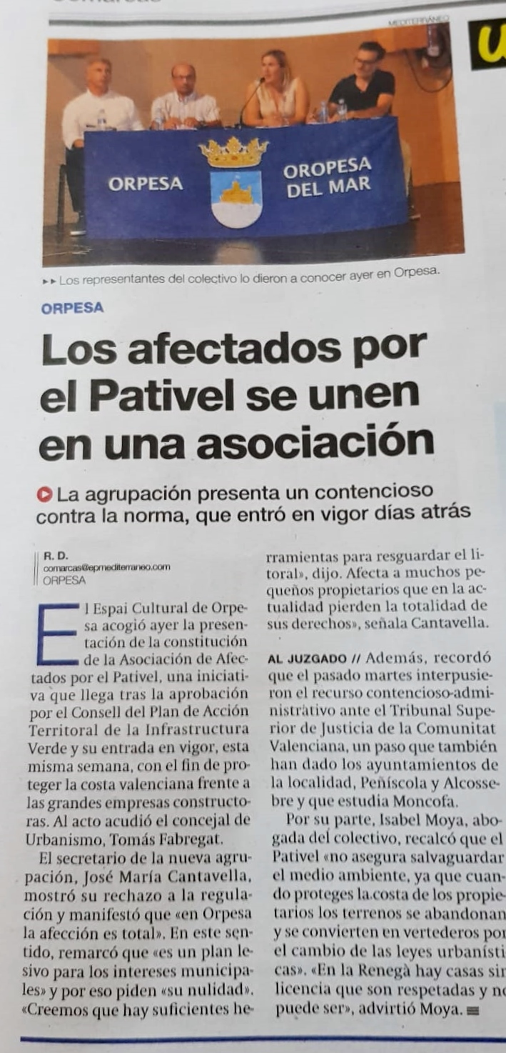 El Plan de Acción Territorial del Litoral (Pativel) es uno de los instrumentos con los que el Consell asegura que reforzará la protección de la costa. Sobre este plan existen 76 contenciosos presentados. La abogada de un grupo de afectados de Castellón, ISABEL MOYA PASCUAL, prevé que en medio año el TSJ comience a dictar sentencia. Incide en que el Pativel no protege las zonas afectadas por el temporal y recuerda que es la Ley de Costas y el Patricova los que afectan a estos terrenos.