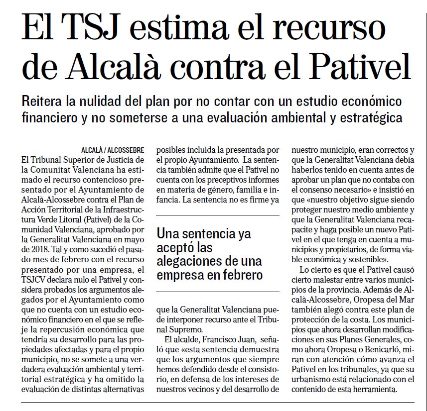 El Tribunal Superior de Justicia de la Comunitat Valenciana ha estimado el recurso contencioso presentado por el Ayuntamiento de Alcalà-Alcossebre contra el Plan de Acción Territorial de la Infraestructura Verde Litoral (PATIVEL) de la Comunitat Valenciana, aprobado por la Generalitat Valenciana en mayo de 2018. Tal y como sucedió el pasado mes de febrero con el recurso presentado por una empresa, el TSJCV declara nulo el PATIVEL y considera probados los argumentos alegados por el Ayuntamiento como que no cuenta con un estudio económico financiero en el que se refleje la repercusión económica que tendría su desarrollo para las propiedades afectadas y para el propio municipio, no se somete a una verdadera evaluación ambiental y territorial estratégica y ha omitido la evaluación de distintas alternativas posibles incluida la presentada por el propio Ayuntamiento. La sentencia también admite que el PATIVEL no cuenta con los preceptivos informes en materia de género, familia e infancia. La sentencia no es firme ya que la Generalitat Valenciana puede interponer recurso ante el Tribunal Supremo.